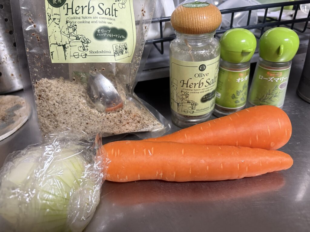 あと、写真に映り込んでいますが、調味料としてハーブソルト、オレガノ、ローズマリーをつかいます