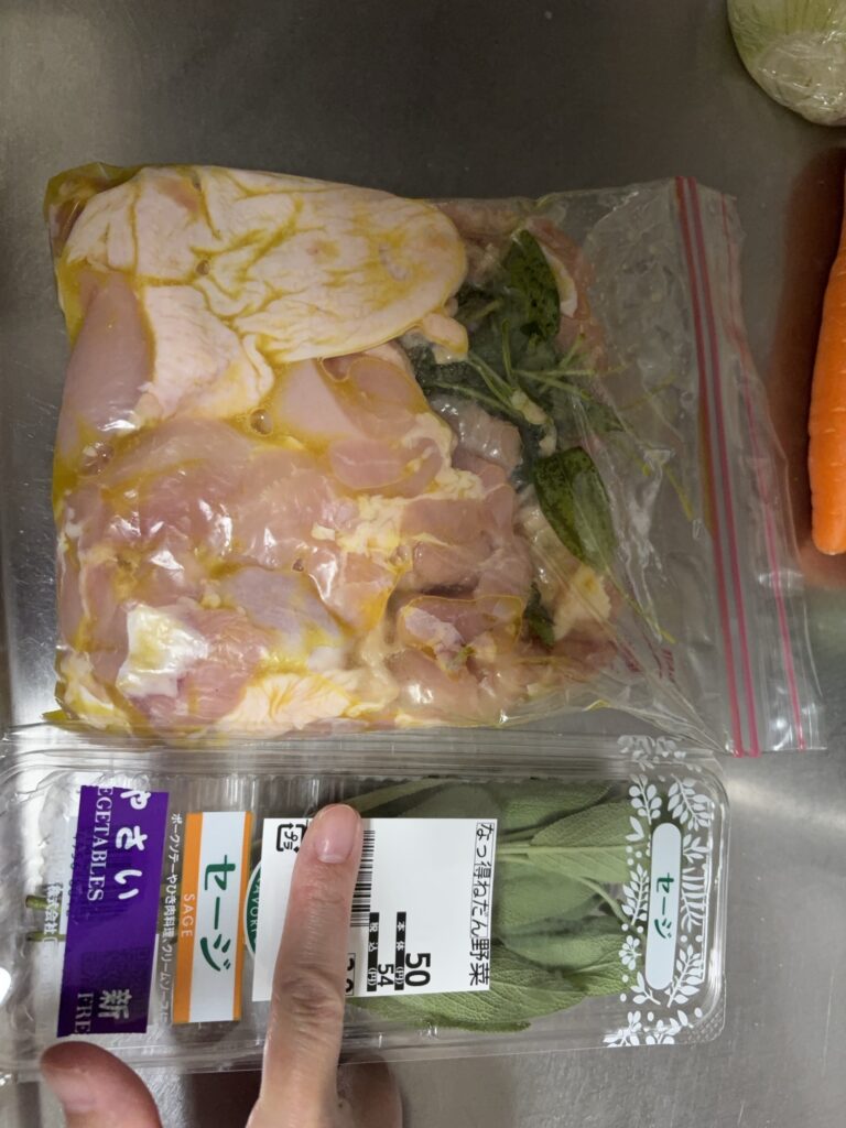 例の如く、スーパーのおつとめコーナーで手に入れた草で肉の臭みをとります